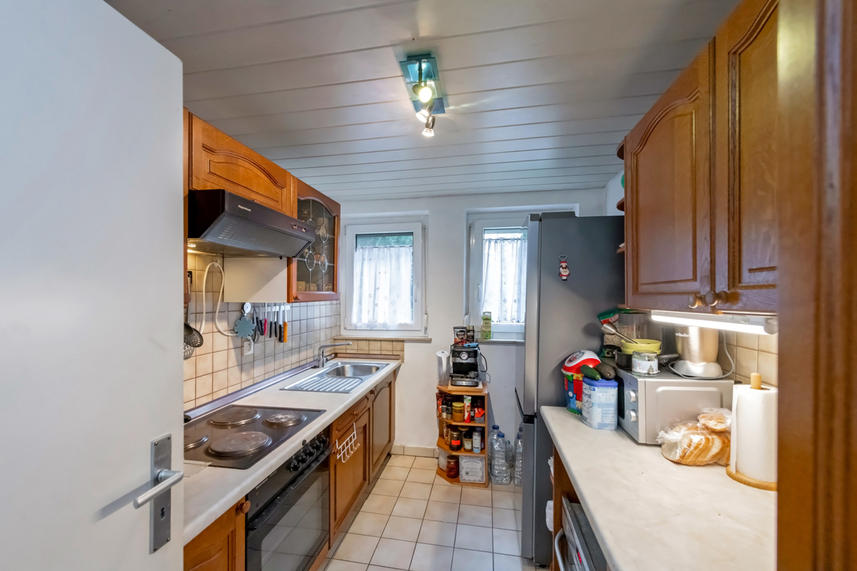 Die freundliche 3-Zimmer-Wohnung ist sehr gut geschnitten. Im Wohnzimmer befindet sich ein moderner Holzofen, welcher im Winter wie in der Übergangszeit eine wohlige Wärme verbreitet, sodass die Nachtspeicheröfen nur als zusätzliche Heizung genutzt werden können. Die großzügigen, doppelt verglasten Kunststofffenster bieten helle und freundliche Räume. Es gibt ein Tageslichtbad mit Dusche; auch die Küche ist mit zwei Fenstern hell, die Einbauküche gehört zur Wohnung dazu. Die Wohnung verfügt über weiße Holzdecken, die Böden sind in den Zimmern Laminat, ansonsten Fliesen.Zur Wohnung gehören außerdem ein Kellerraum, ein Holzlagerraum und eine gemeinschaftliche Waschküche. Die zur Wohnung gehörende Garage (mit elektrischem Tor) befindet sich ebenfalls im Gebäude und ist mit wenigen Schritten von der Wohnung durch das Treppenhaus erreichbar. Der große Garten hinter dem Haus ist eine herrliche Wellness-Oase vor allem in den Sommermonaten. Die Wohnung ist derzeit vermietet.